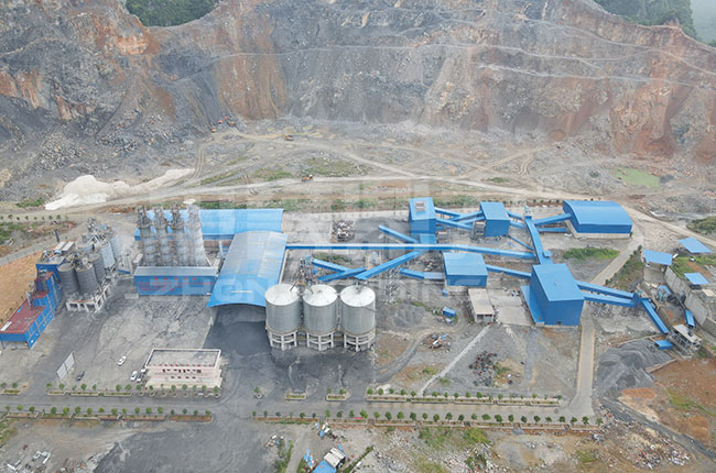 采用了振動給料機、顎式破碎機、圓錐破碎機、沖擊制砂機與圓振動篩的配置。